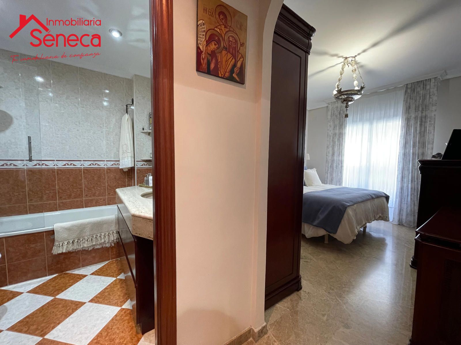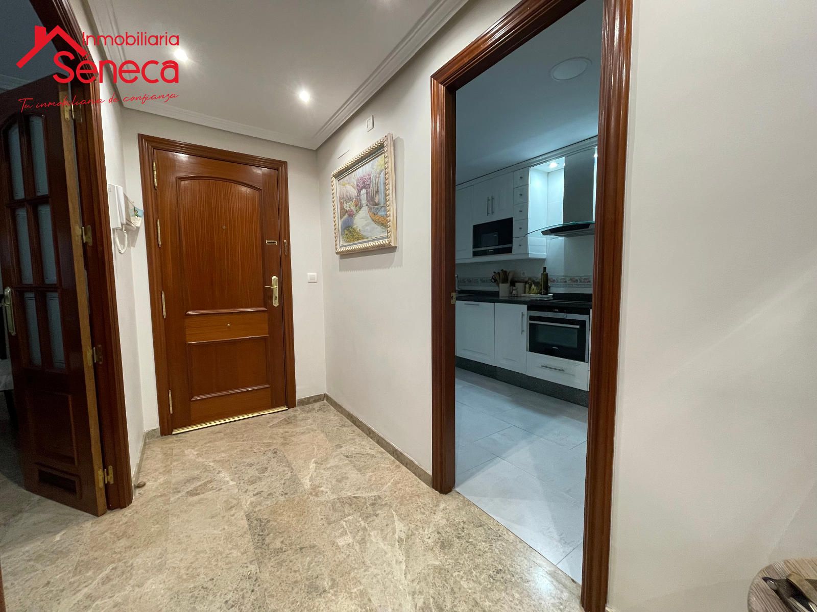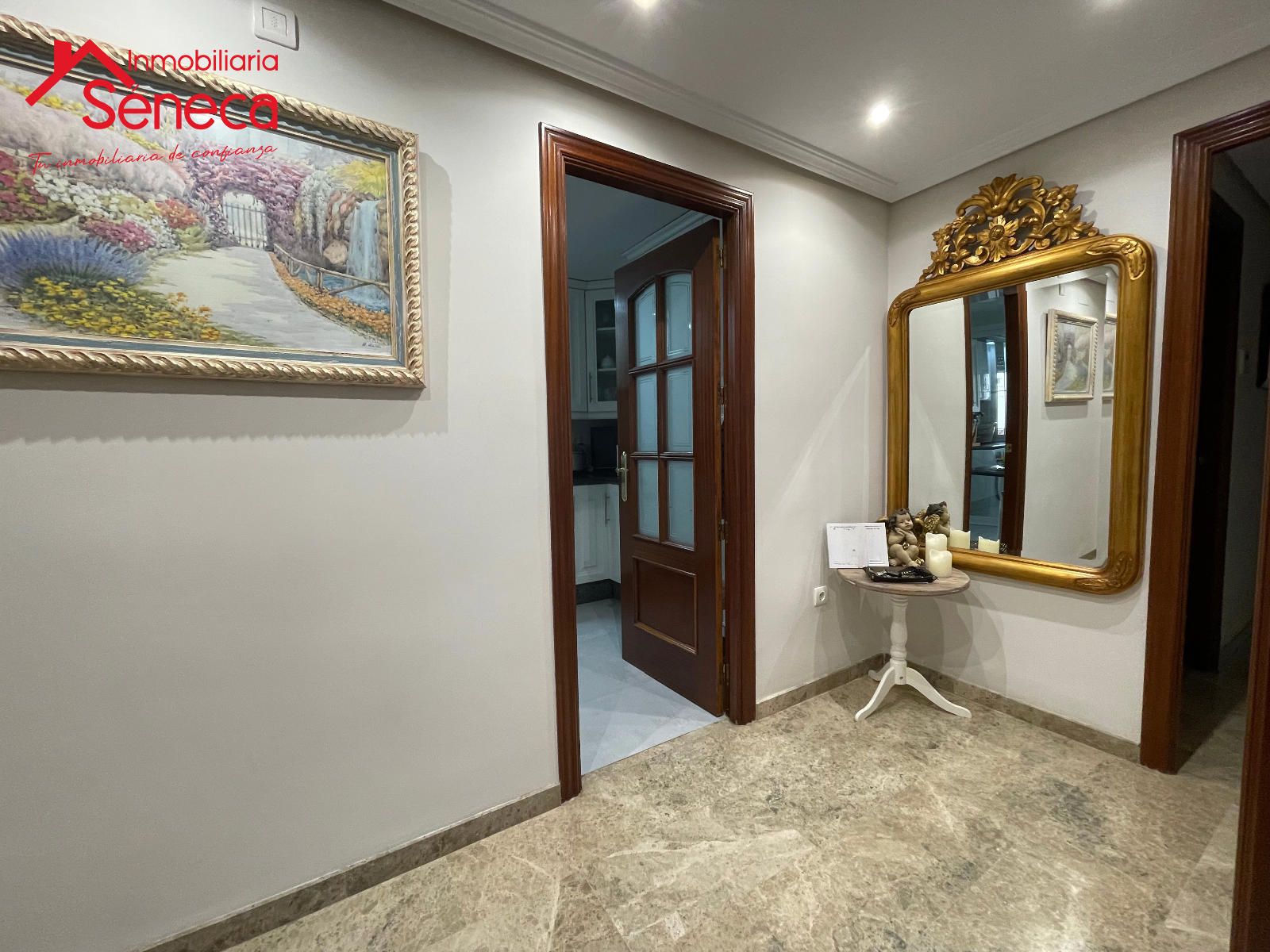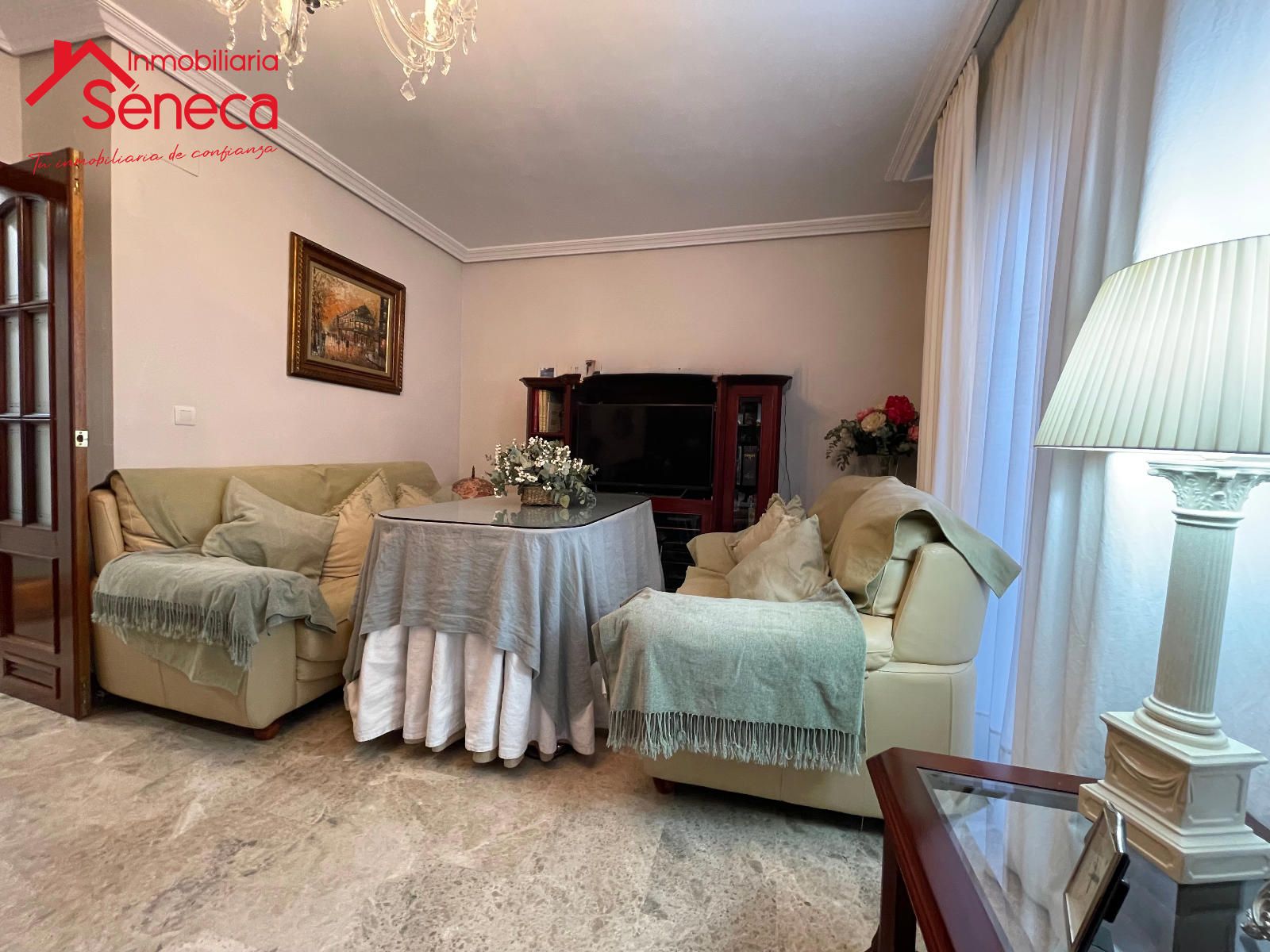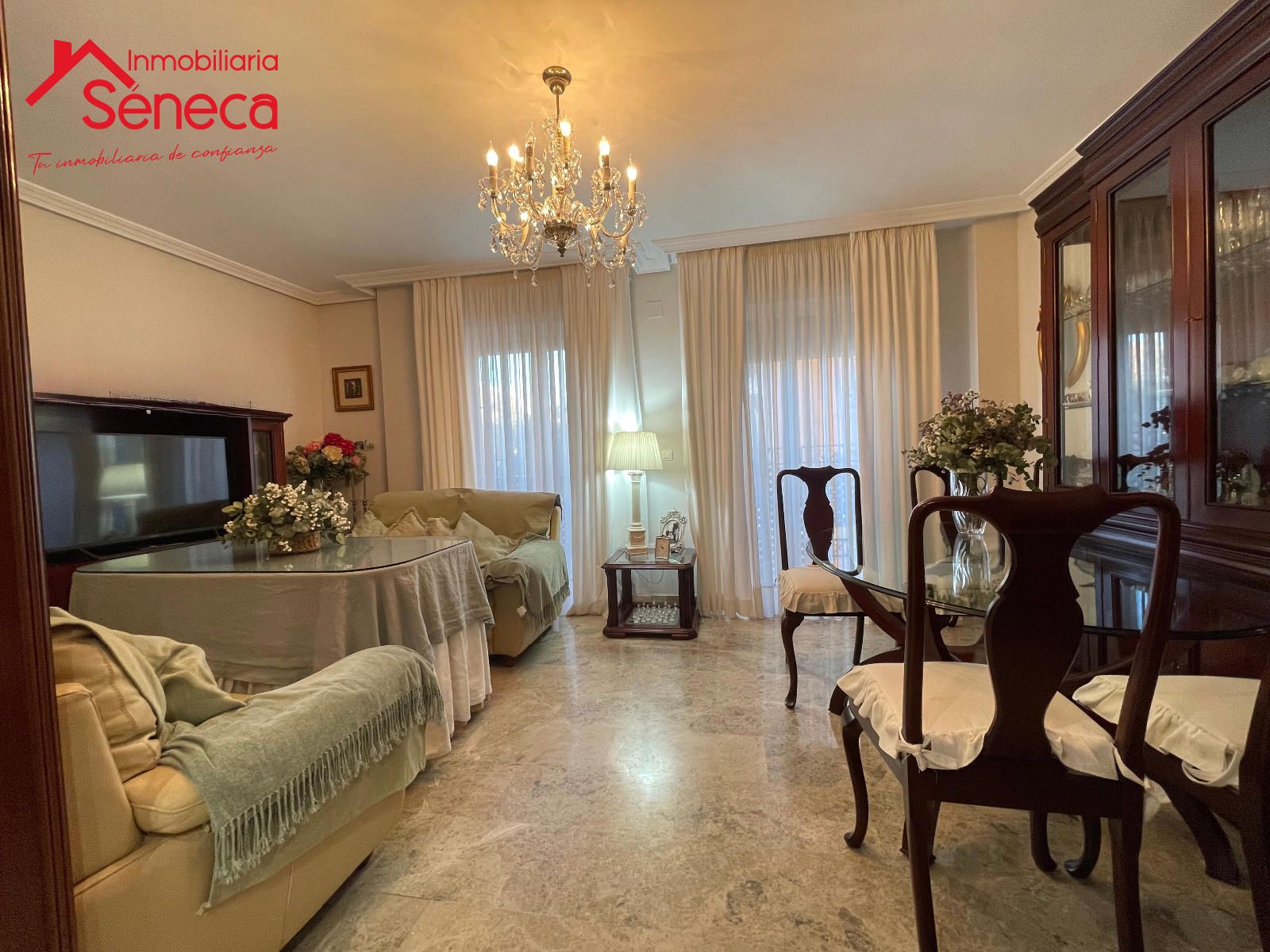 El salón es espacioso y acogedor, perfecto para reuniones familiares o momentos de descanso. La vivienda destaca por sus elegantes suelos de mármol, que aportan distinción y frescura, y por su excelente estado de conservación.